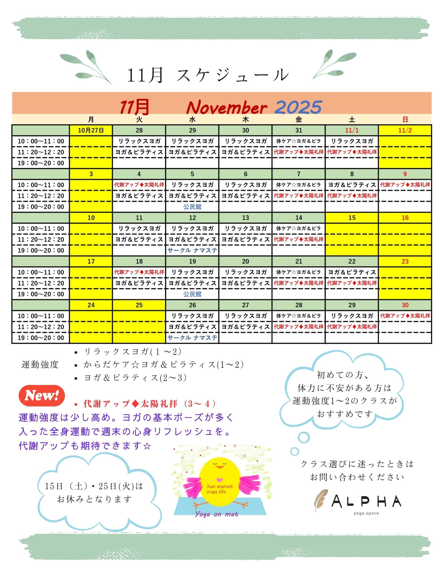 2025.10.20 冬季に向けて、「夜のリラックスヨガ」のクラス数を少なくしていく予定です。 週末の活発なヨガクラス「代謝アップ☆太陽礼拝」のクラス数などを増やしておりますので、ぜひ「運動は夜派」から「運…