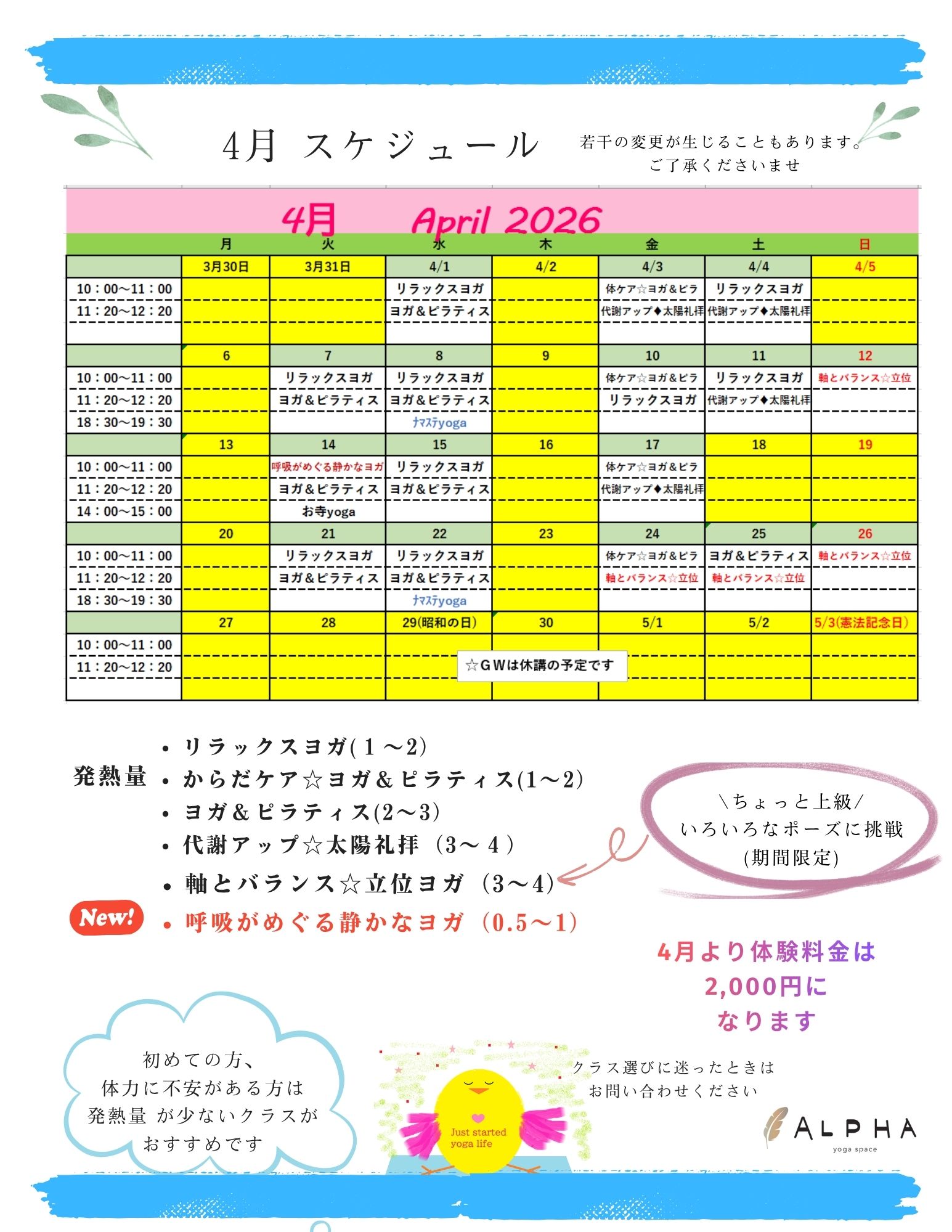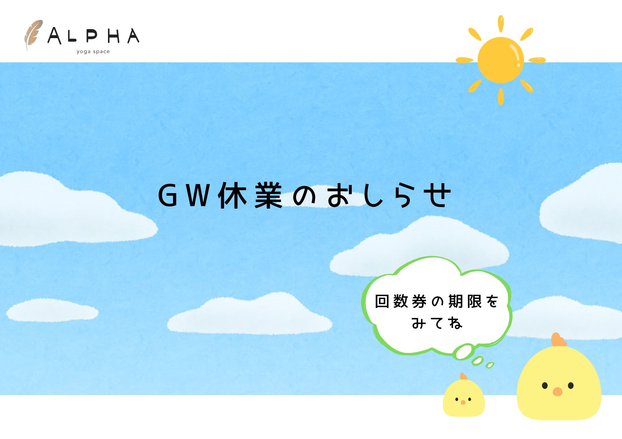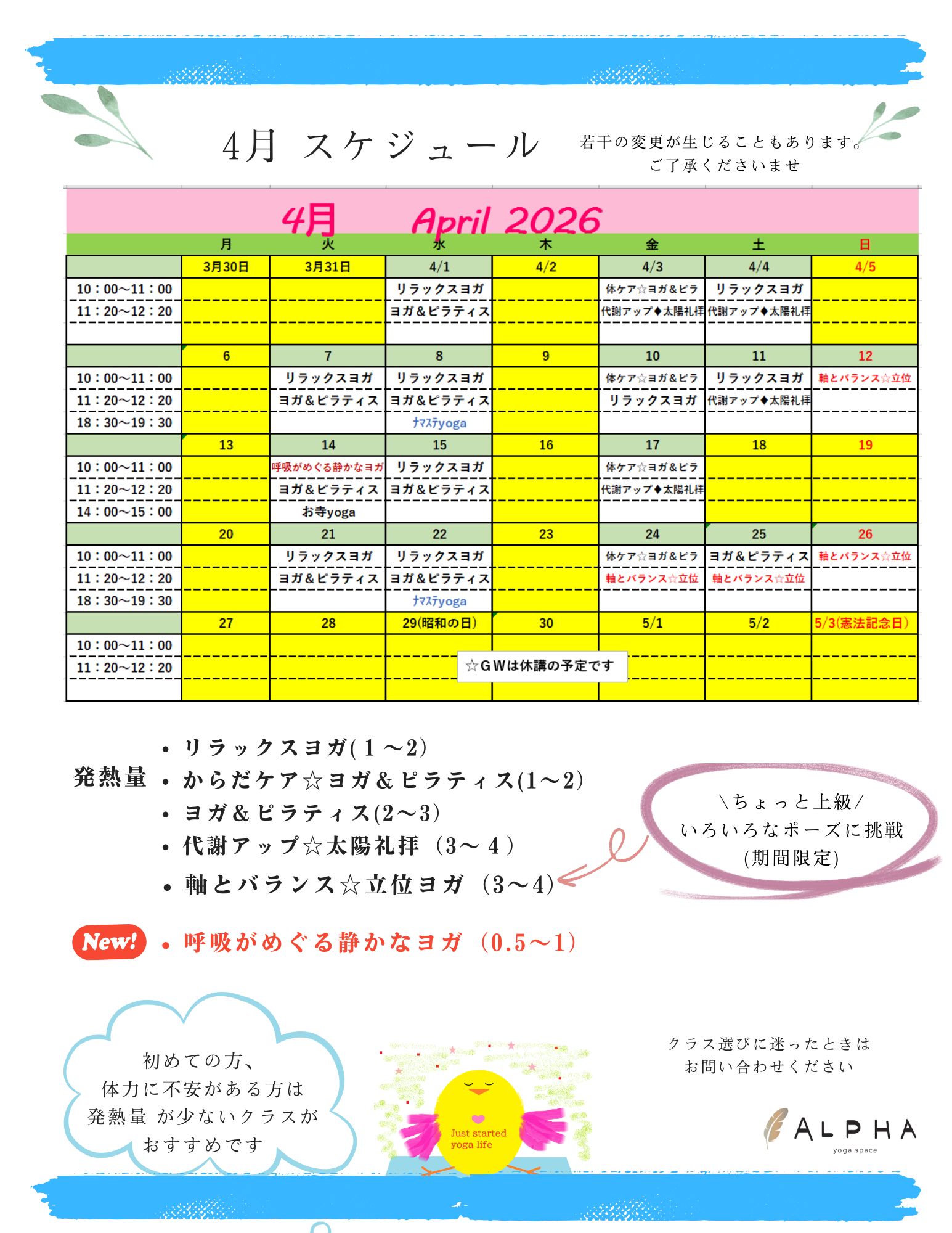 2026.03.03 4/28(日)~5/6(月)はお休みいたします。 スタジオも少しだけ羽休めを🐤 回数券の有効期限をご確認のうえ、 もったいなくならないよう、ぜひご活用くださいませ。 …